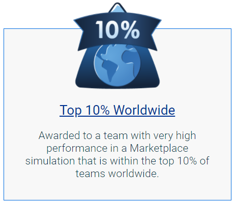 Awarded to the winning leader upon completion of a Marketplace simulation. The winning leader in Marketplace is determined by the highest cumulative Balanced Scorecard within a game across six simulated business quarters. Therefore, the holder of this badge demonstrated the business skills and work ethic necessary to manage their company toward excellence over crucial stages of the company’s life cycle.